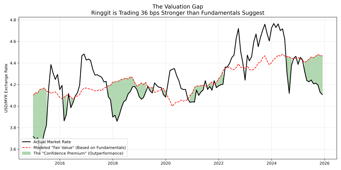 While technical analysis points to the 4.05–4.10 range, broader quantitative valuation models highlight a distinct decoupling from historical fundamentals. A regression analysis of the Ringgit’s primary drivers over the last decade—specifically US Interest Rates, Brent Crude, and Global Tech Cycles—reveals a significant divergence in late 2025.