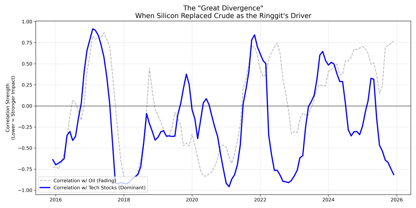 As shown in the data, the correlation coefficient between the Ringgit and Oil Prices (Gray Line) has collapsed toward zero, rendering crude oil statistically less relevant to recent price action. Conversely, the correlation with the Global Semiconductor Index (Blue Line) has surged. The Ringgit has effectively transitioned from a “Petro-Beta” to a “Tech-Beta” currency, implying that the nation’s fortunes are now tied more closely to the global silicon cycle than to OPEC+ quotas.